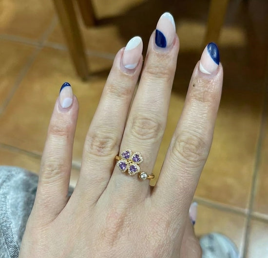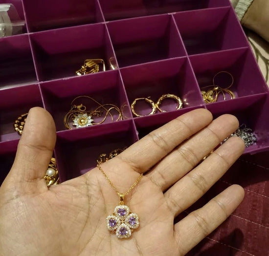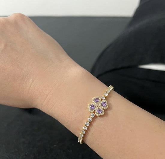 Embrace regal elegance with the Royal Bloom Necklace. This exquisite piece features a captivating four-leaf clover pendant, intricately crafted with a radiant gold finish. Each of the four heart-shaped leaves is set with a rich, purple gemstone, surrounded by a sparkling halo of smaller, clear stones that catch the light with every movement. A central purple stone completes the blossoming design. Suspended from a delicate gold chain, this necklace is a symbol of luck and luxurious beauty, perfect for adding a touch of sophistication to any ensemble.